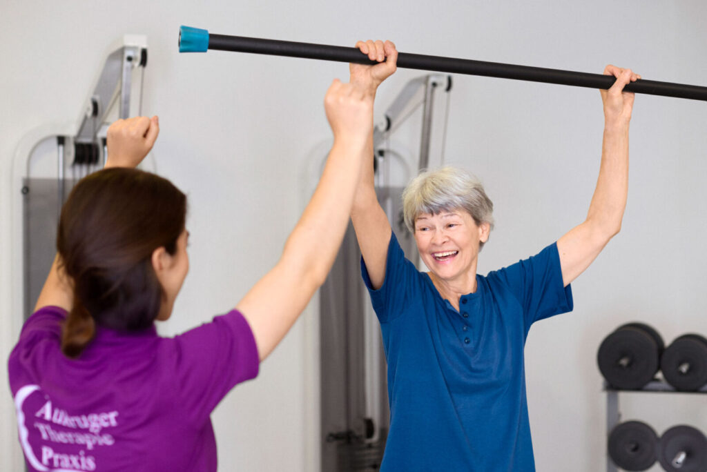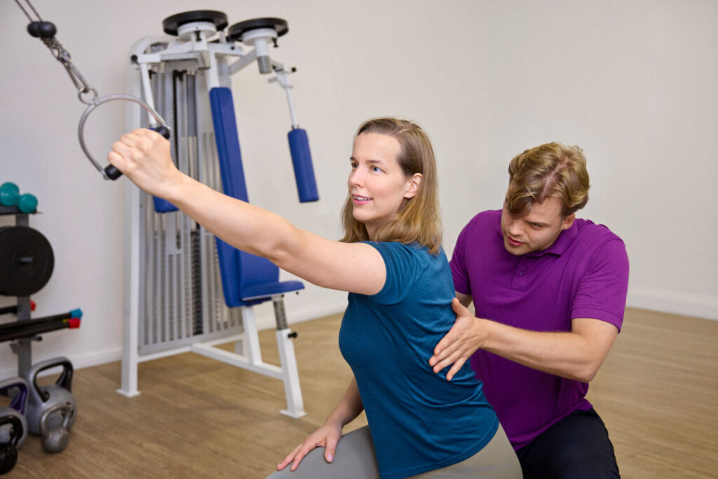 Aktives Training an Großgeräten, Kleingeräten und mit freien Gewichten, um spezifische Ziele zu erreichen, wie zum Beispiel Kräftigung, Stabilisierung, Verbesserung der Koordination oder des Gleichgewichts.